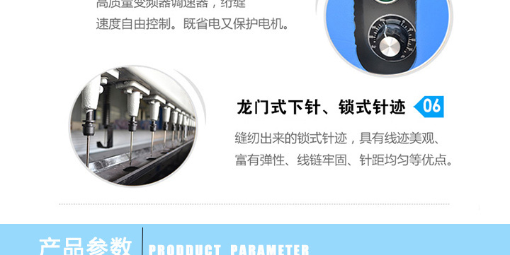 產品簡介:本機所縫的鎖式針跡,具有線跡美觀、富有彈性、線鏈牢固、針距均勻等優點。把易 損易壞的部件改換耐磨材料,克服不易調整、維修的缺點,增加電控系統,使機器更好操 作等特點。