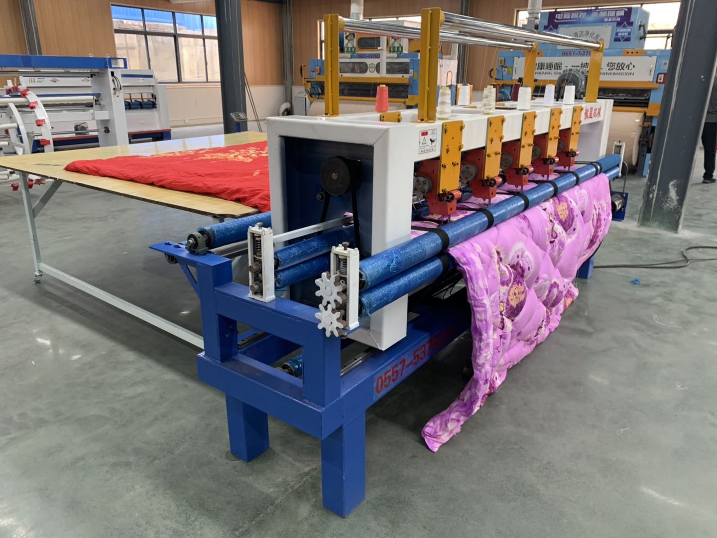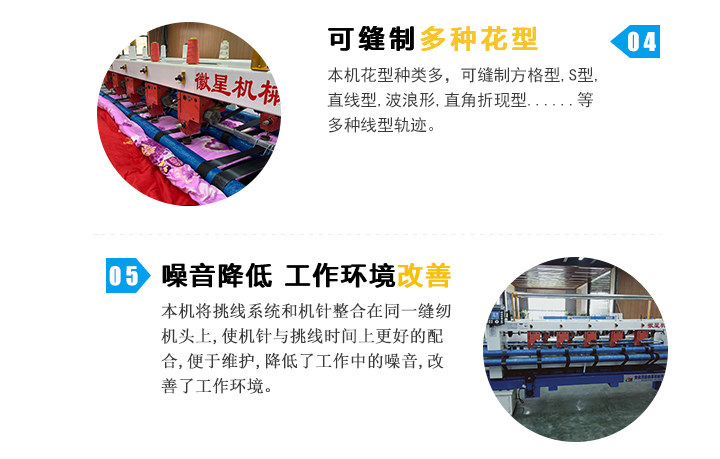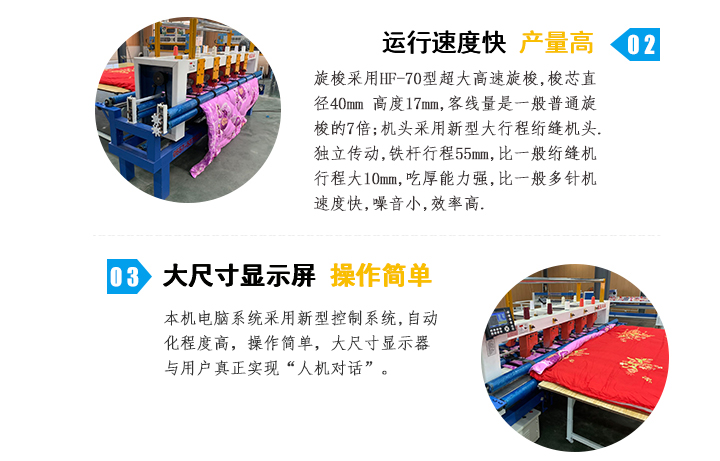 高速多針電腦絎縫機集電腦絎縫機,多針底線直絎機及家用縫紉機的優點,集成度高,絎縫速度快,花型種類多,是本公司新研制的新一代高速電腦絎縫機。